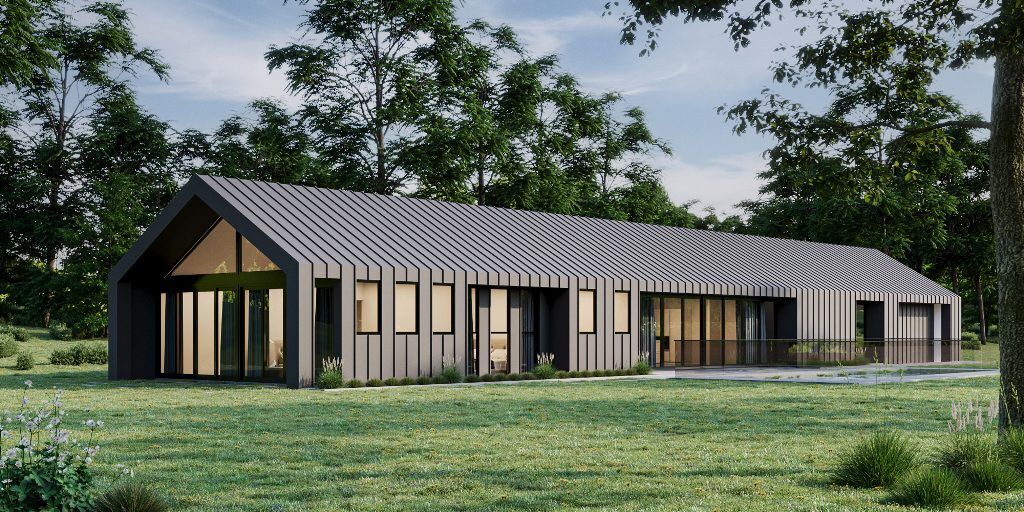 The residence’s material palette incorporates gun metal grey single-lock standing seam steel cladding. The architectural design utilizes clean contemporary lines of a 30 degree pitch roof with either secret or expressed rainwater gutters. The architectural specification specifies horizontally formatted hardwood timber cladding to the eaves covered gable ends. The barndominium house design enjoys visually distinct spaces with a modest budget to enrich daily life. The building’s services can include a solar hot water unit with double-sided wood firebox for wood boosting during winter months. The generous eight foot high/2400mm glazed doors usher visitors into the barndominium house design open plan living areas. The architect designed kitchen that connects the open plan incorporates the latest porcelain panel bench-tops with waterfall edge. Further, the kitchen exhibits Blum Adventos lift colored back glass overhead cupboards with Madinoz fixtures and fittings.