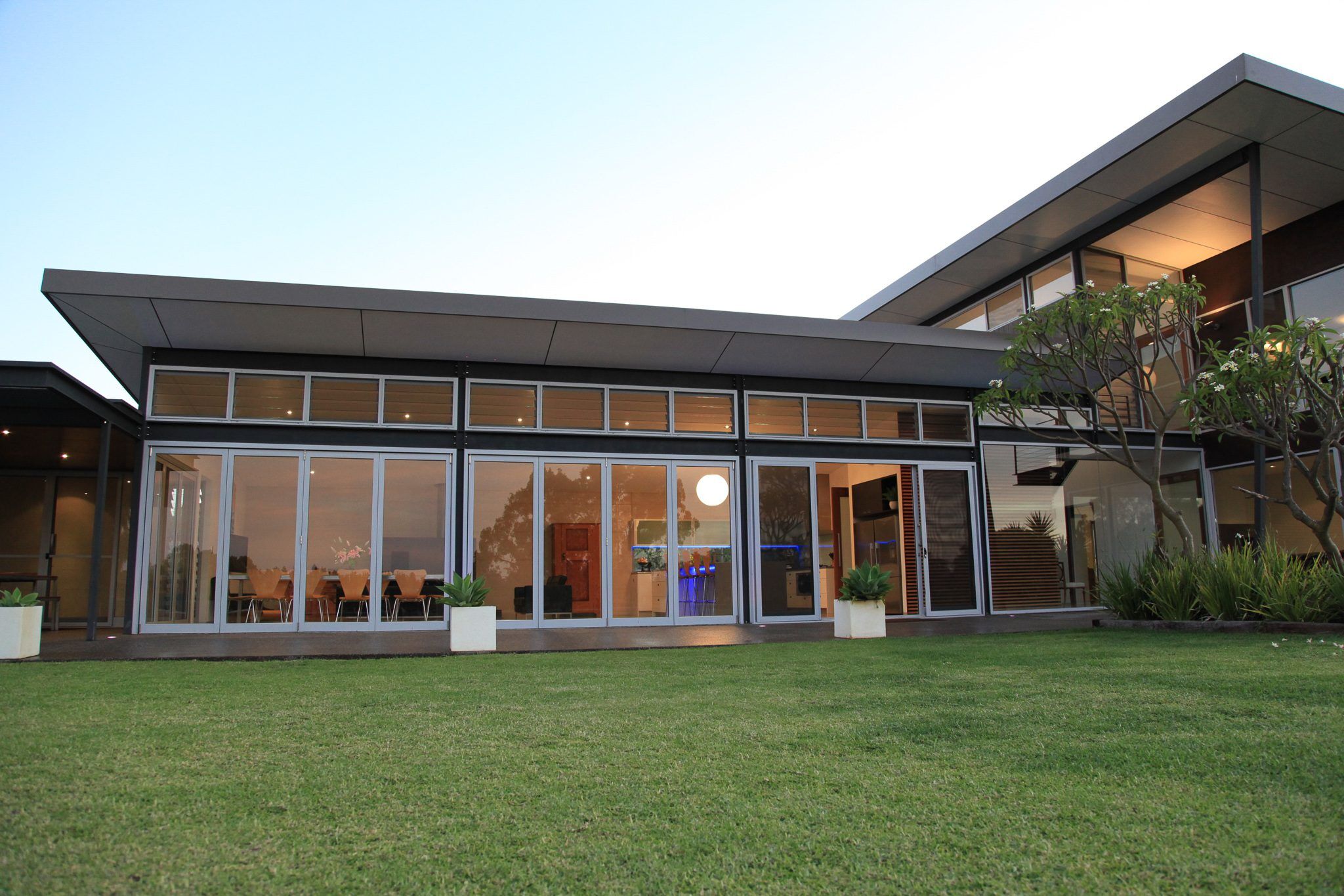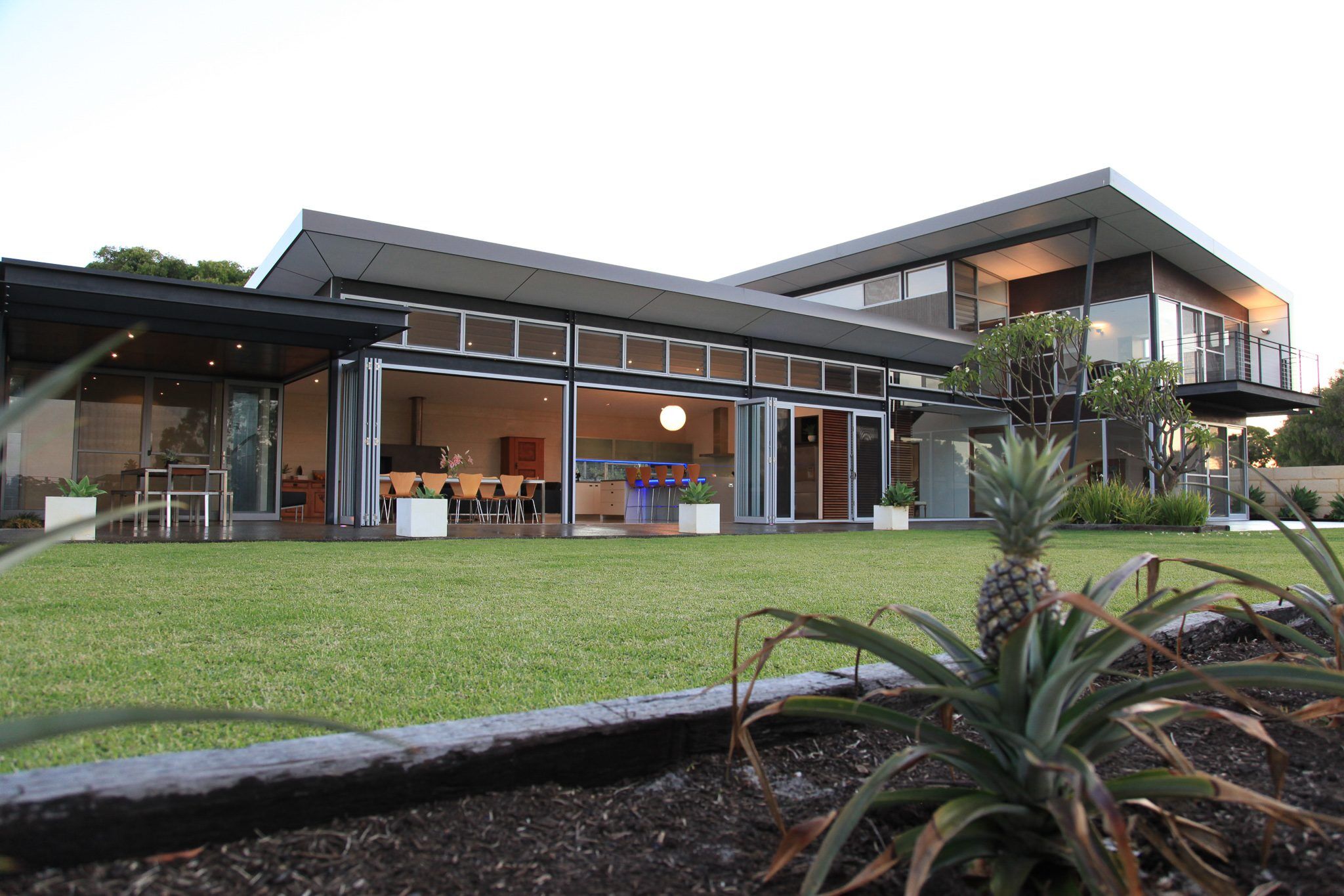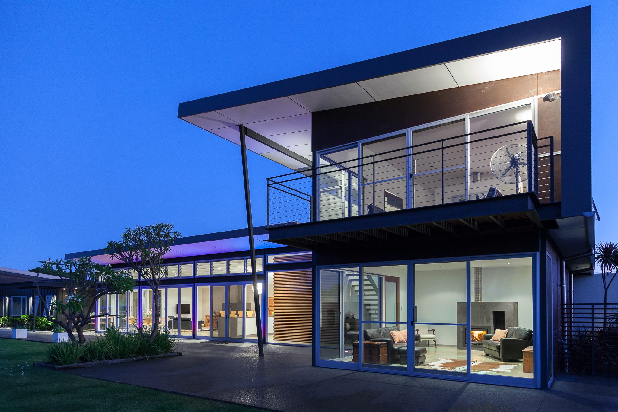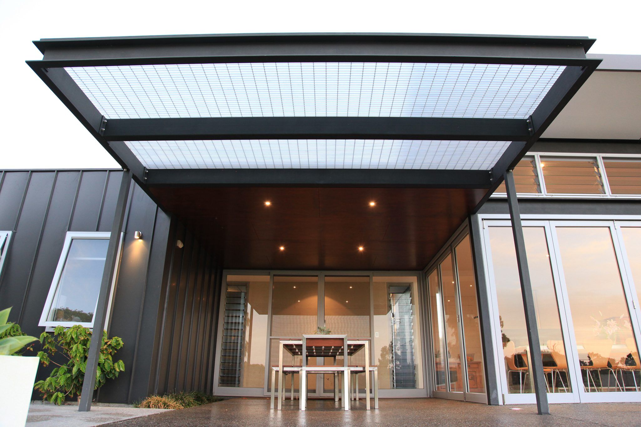 The residence also features operable glass louvres to the underside of roof eaves on the shaded elevation. The louvers generate cross ventilation for hot summer months for the cooling of the open-plan kitchen, living and dining. The contemporary ranch house plans boast direct sunlight spilling across the open plan living black oxide burnished concrete floor.The radiant energy of the direct sunlight is captured during the cooler winter months during daylight hours. The radiant heat is released from the building’s thermal mass heat sink throughout winter evenings. The operable windows and louvers to the living areas of the contemporary ranch house plans maximizes winter solar heat gain. The solar passive design during winter reduces the need for artificial heating and on-going utility costs.