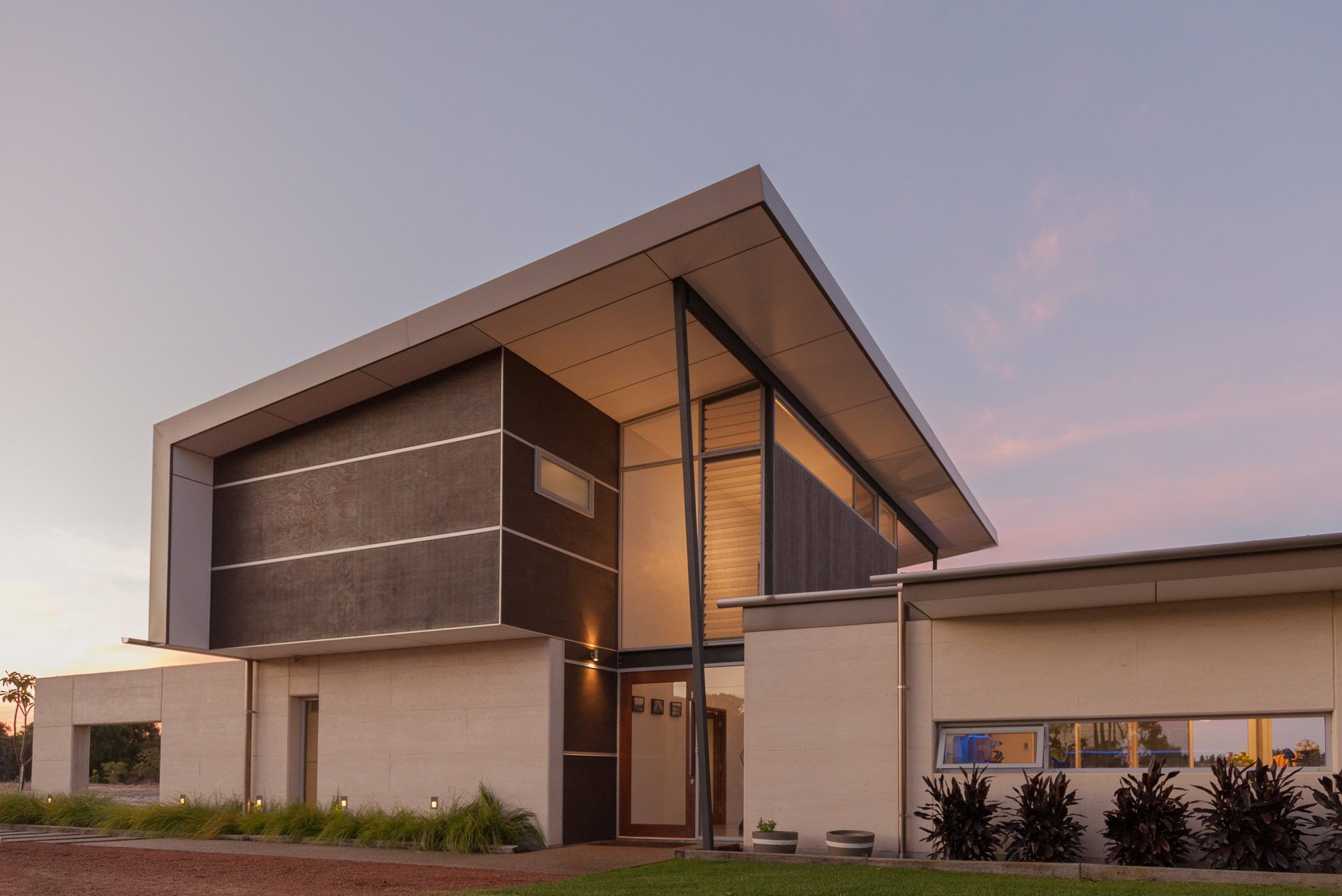 The architectural design achieves a coherent solar passive design principles through a generous allocation of south orientated glazing. The deep penetration of the lower azimuth winter sun for heat gain over the cooler winter months. Generous skillion eaves exclude direct sunlight from the fenestration during the hot summer months. The highlight glass louvres create stack effect ventilation in living areas to contribute to internal ambient air temperature summer. Depending on site, property owners can also choose to incorporate air conditioning in the solar passive design.