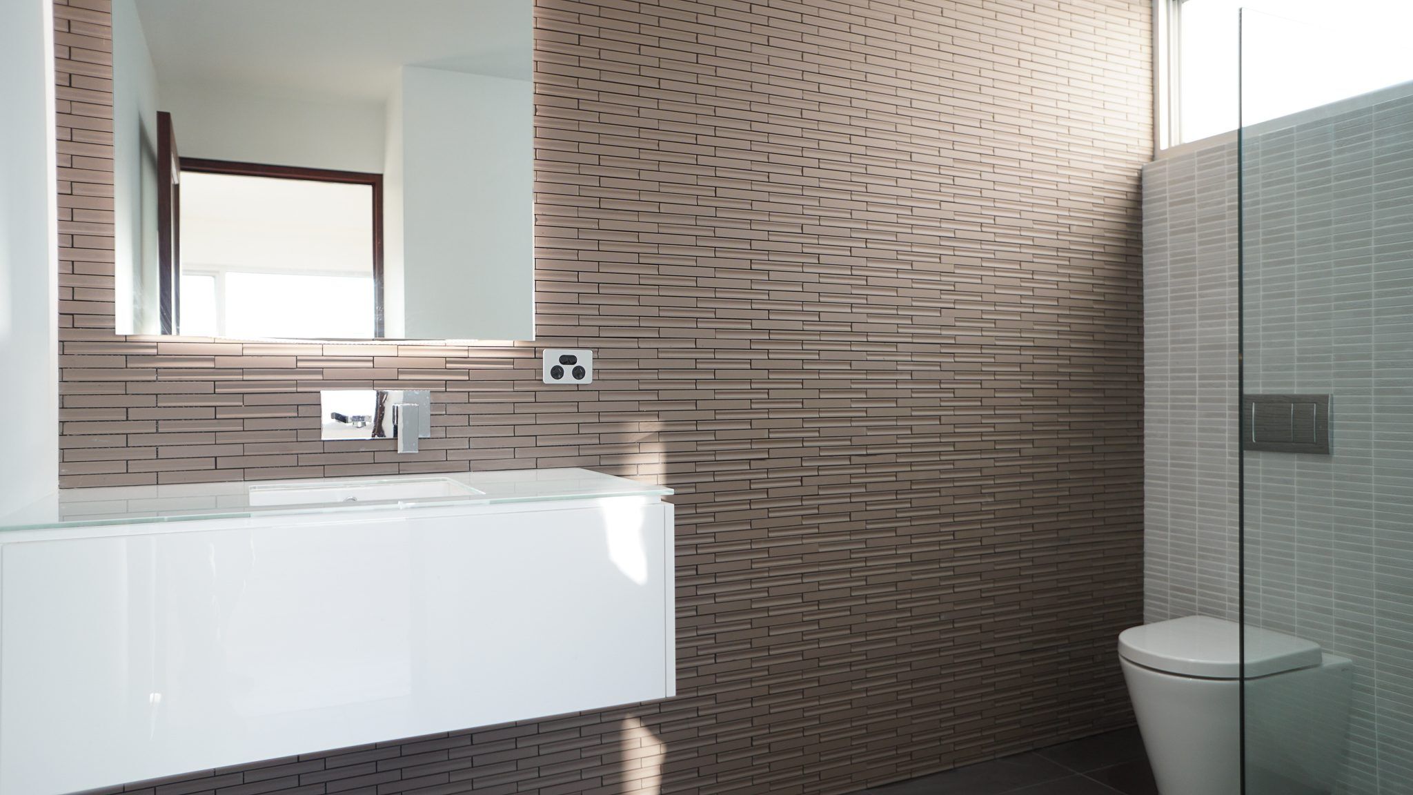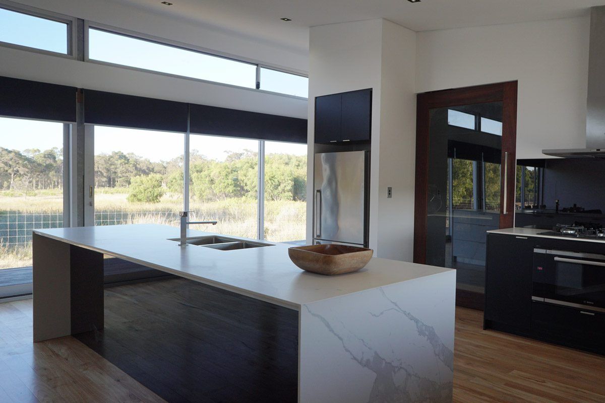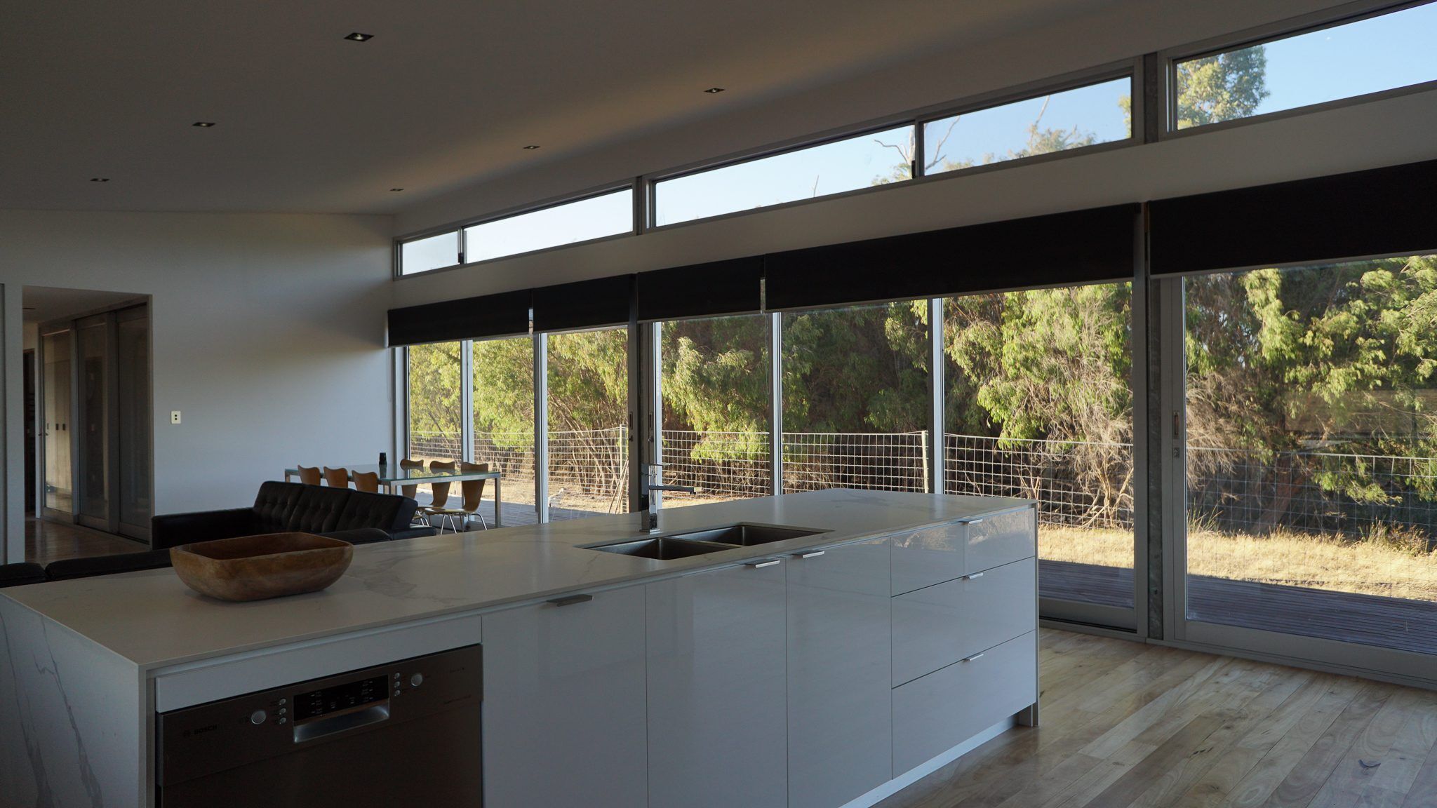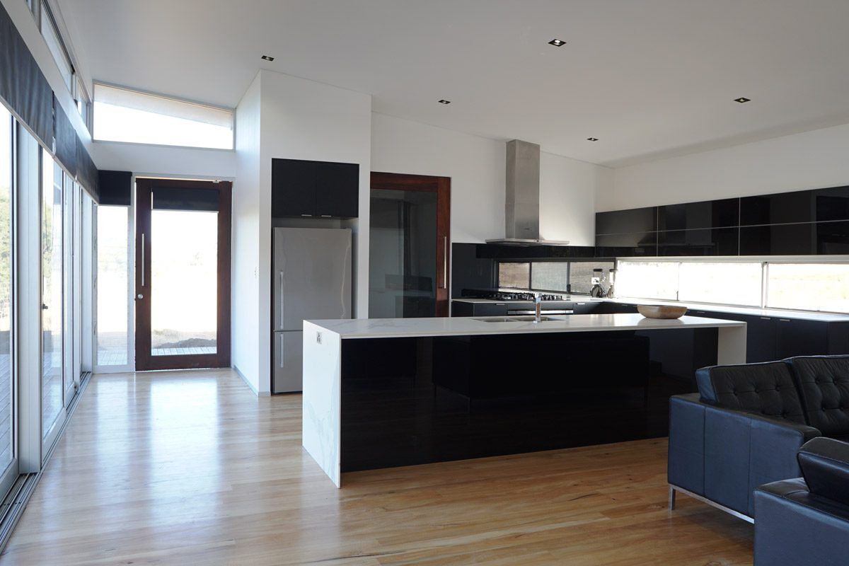 The hub of the skillion house plans is the architect designed kitchen. The kitchen incorporates the latest porcelain panel selections to the waterfall edged kitchen island bench. The generous 4’/1200mm island bench accentuates the relationship between the kitchen hub and adjacent two living areas. The skillion house plans of this sustainable house design also boast the latest porcelain panel selections. The perimeter bench-tops and Blum Adventos lift colored back glass overhead cupboards. Kitchen overhead cupboards are cantilevered above the 2’/600mm high bench-top height slot window.