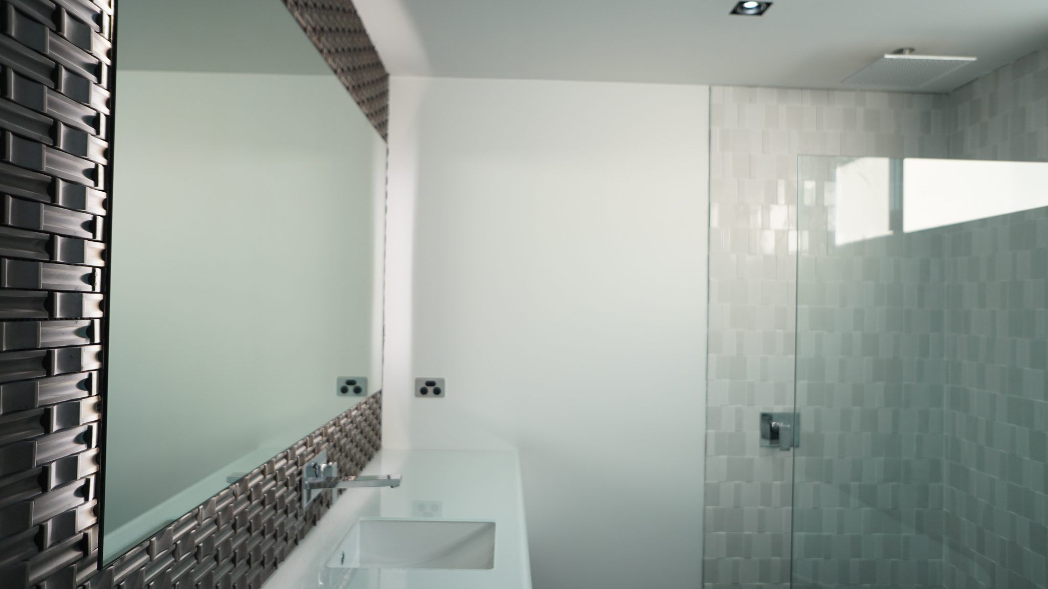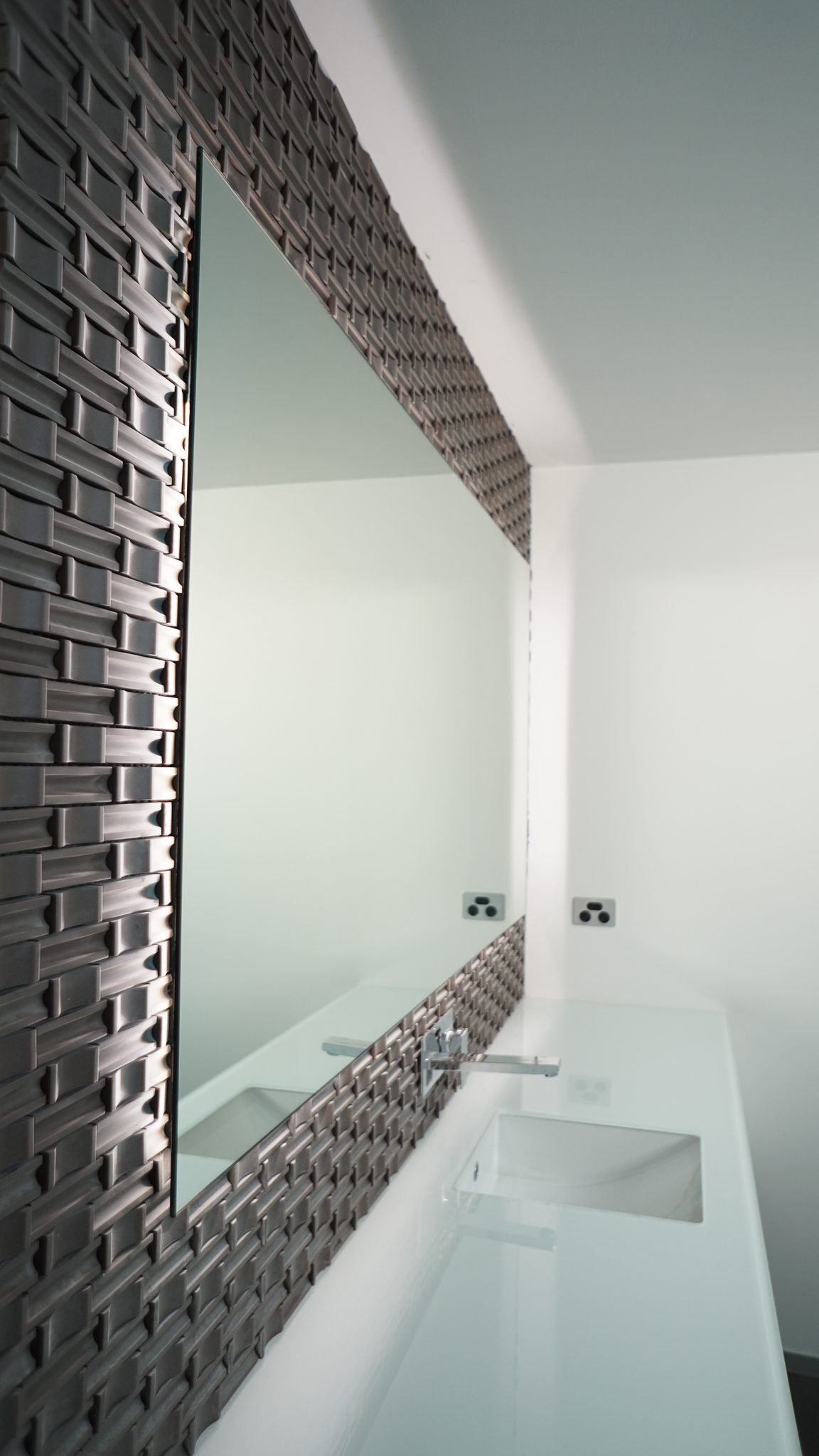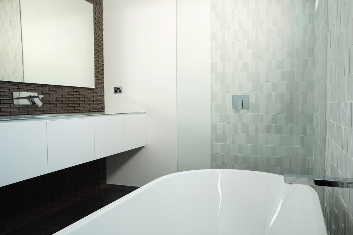 The hub of the skillion house plans is the architect designed kitchen. The kitchen incorporates the latest porcelain panel selections to the waterfall edged kitchen island bench. The generous 4’/1200mm island bench accentuates the relationship between the kitchen hub and adjacent two living areas. The skillion house plans of this sustainable house design also boast the latest porcelain panel selections. The perimeter bench-tops and Blum Adventos lift colored back glass overhead cupboards. Kitchen overhead cupboards are cantilevered above the 2’/600mm high bench-top height slot window.