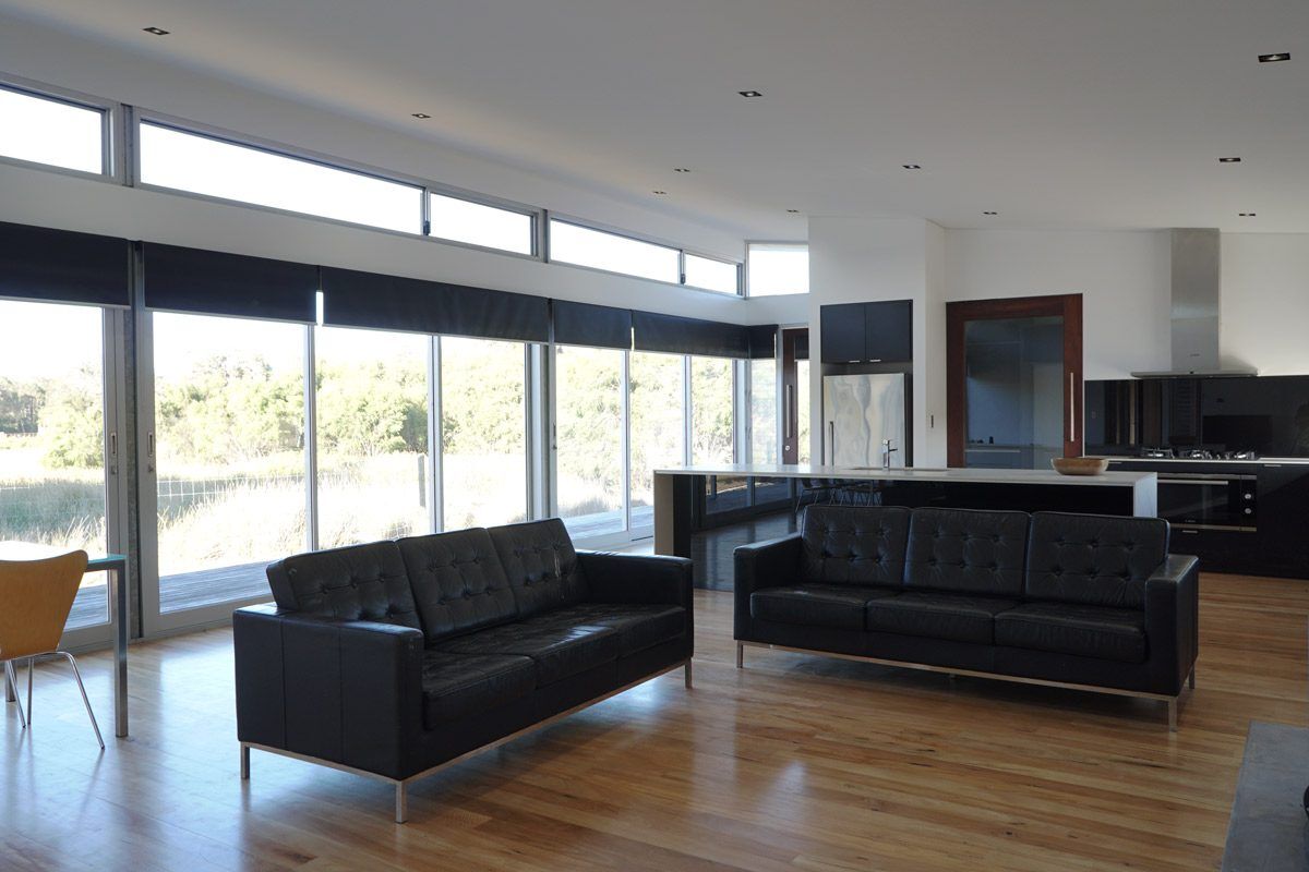 Corten steel, locally sourced hardwood timber flooring and steel grey paint finish James Hardie cladding are the residence’s material palette. The skillion house plans achieve a green building design with a meager budget with slab on ground construction. Client’s can utilize the cost effective patented prefab footing system, solar hot water and wood fuel firebox for wood boosting. Visitors to the residence are greeted with a generous 8 feet/2400mm high double glazed timber pivot door. Visitors are then ushered into the spacious sustainable house design open plan living areas.